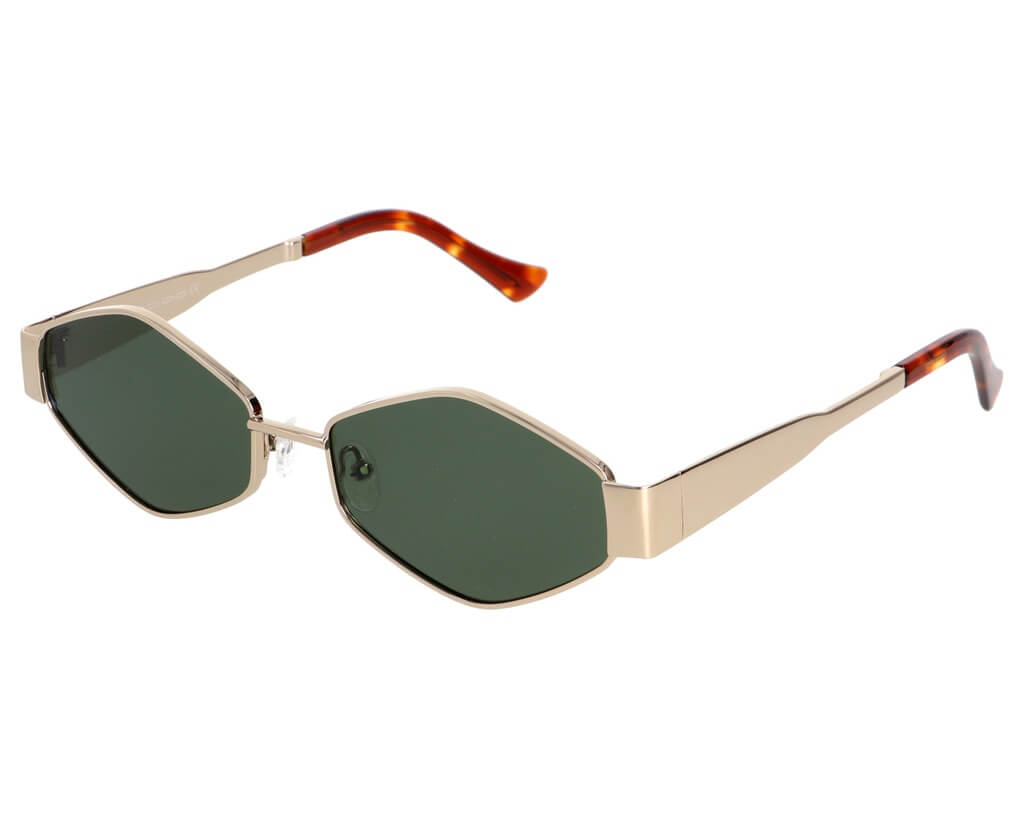 Montura unisex en metal de la marca Bemboo con forma hexagonal en color dorado, combina lentes en verde uniforme de categoría 3. Visita nuestro centro óptico en Santiago de Compostela ¡Te esperamos!