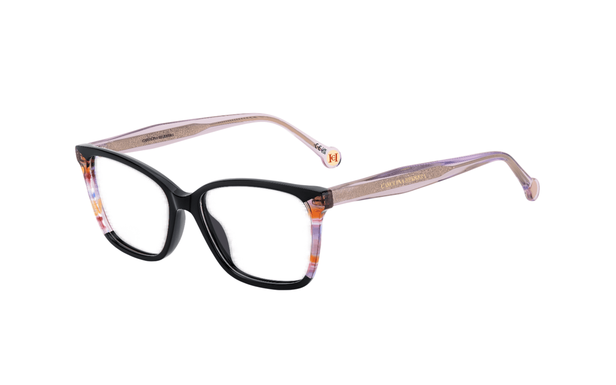 Montura femenina en acetato con forma rectangular de la marca Carolina Herrera en color negro, combina detalles en morado y coral en los laterales, las varillas son moradas translúcidas. Visita nuestro centro óptico en Santiago de Compostela ¡Te esperamos!