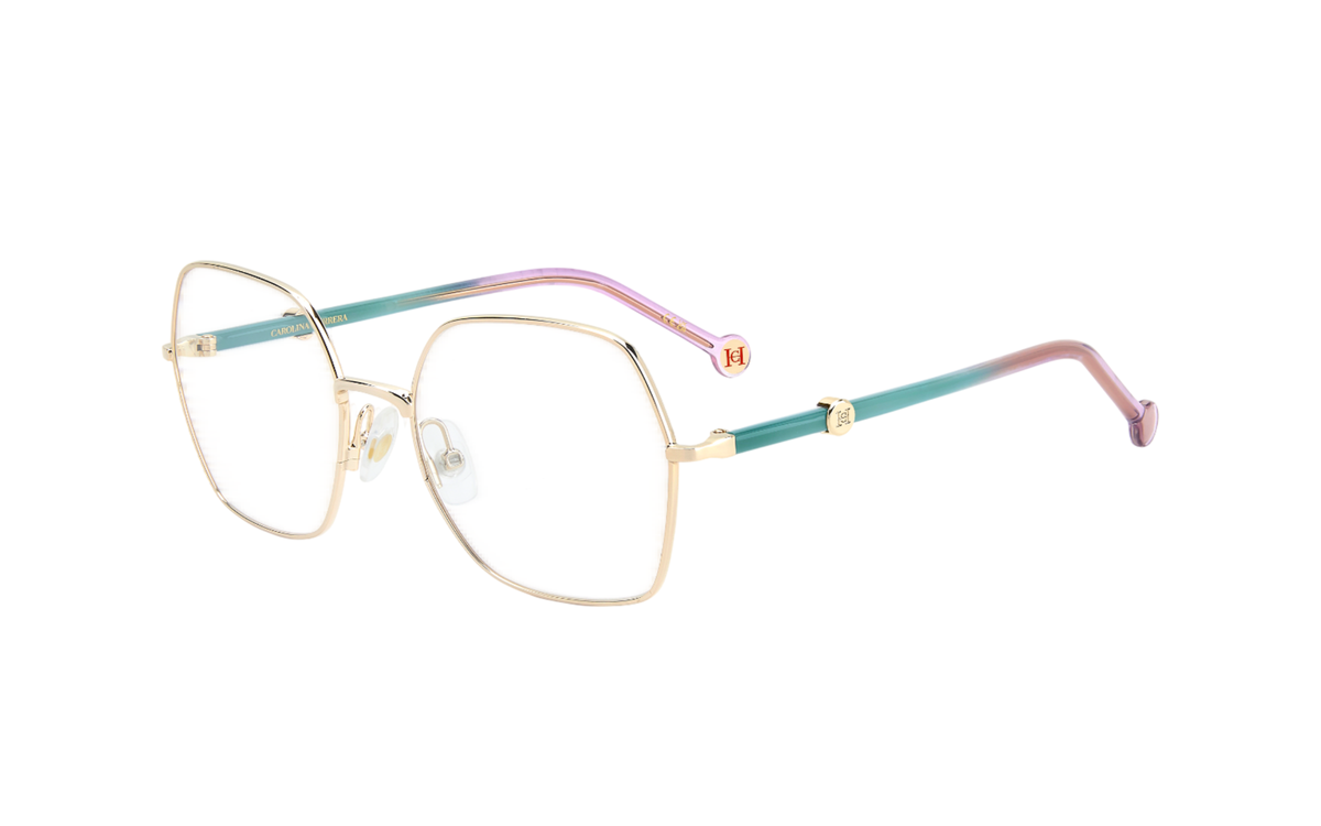 Montura femenina en metal con ligera forma hexagonal de la marca Carolina Herrera en color dorado, combina acetato en varillas en verde agua y morado. Visita nuestro centro óptico en Santiago de Compostela ¡Te esperamos!