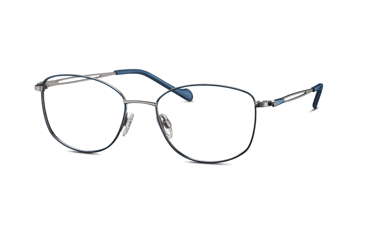 Montura metálica de titanio con ligera forma rectangular en color pletaeado, combina aro y terminales en azul. Visita nuestro centro óptico en Santiago de Compostela ¡Te esperamos!