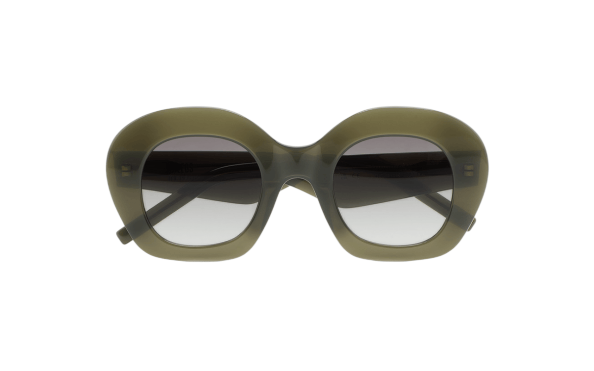 Montura femenina en acetato marcado con forma redondeada de la marca Kaleos en tono verde. Lentes de color verde degradado con antirreflejante por la cara interna de categoría 2. Visita nuestro centro óptico en Santiago de Compostela ¡Te esperamos!