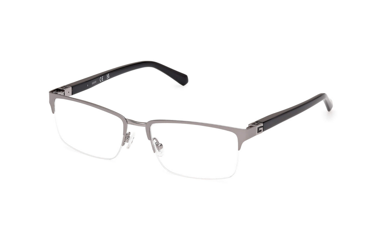 Montura metálica nylor con forma rectangular de la marca Guess en color plateado, combina varillas en acetato negro. Visita nuestro centro óptico en Santiago de Compostela ¡Te esperamos!