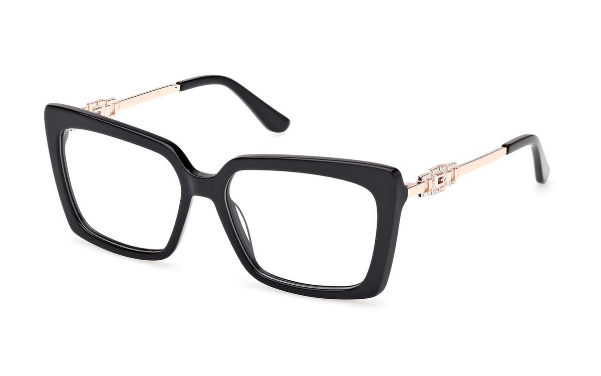 Montura femenina en acetato de la marca Guess con forma rectangular en color negro, combina varillas en dorado rosa con "strass". Visita nuestro centro óptico en Santiago de Compostela ¡Te esperamos!