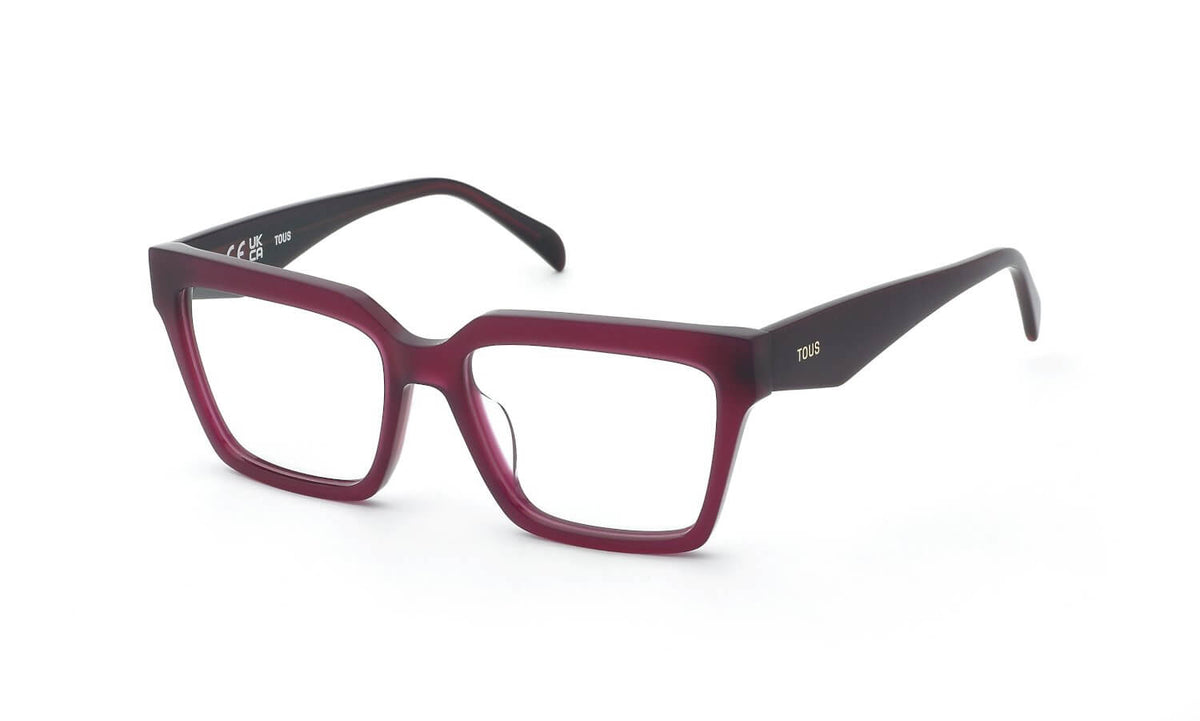 Montura femenina en acetato con forma marcada cuadrada de la marca Tous en color burdeos. Visita nuestro centro óptico en Santiago de Compostela ¡Te esperamos!