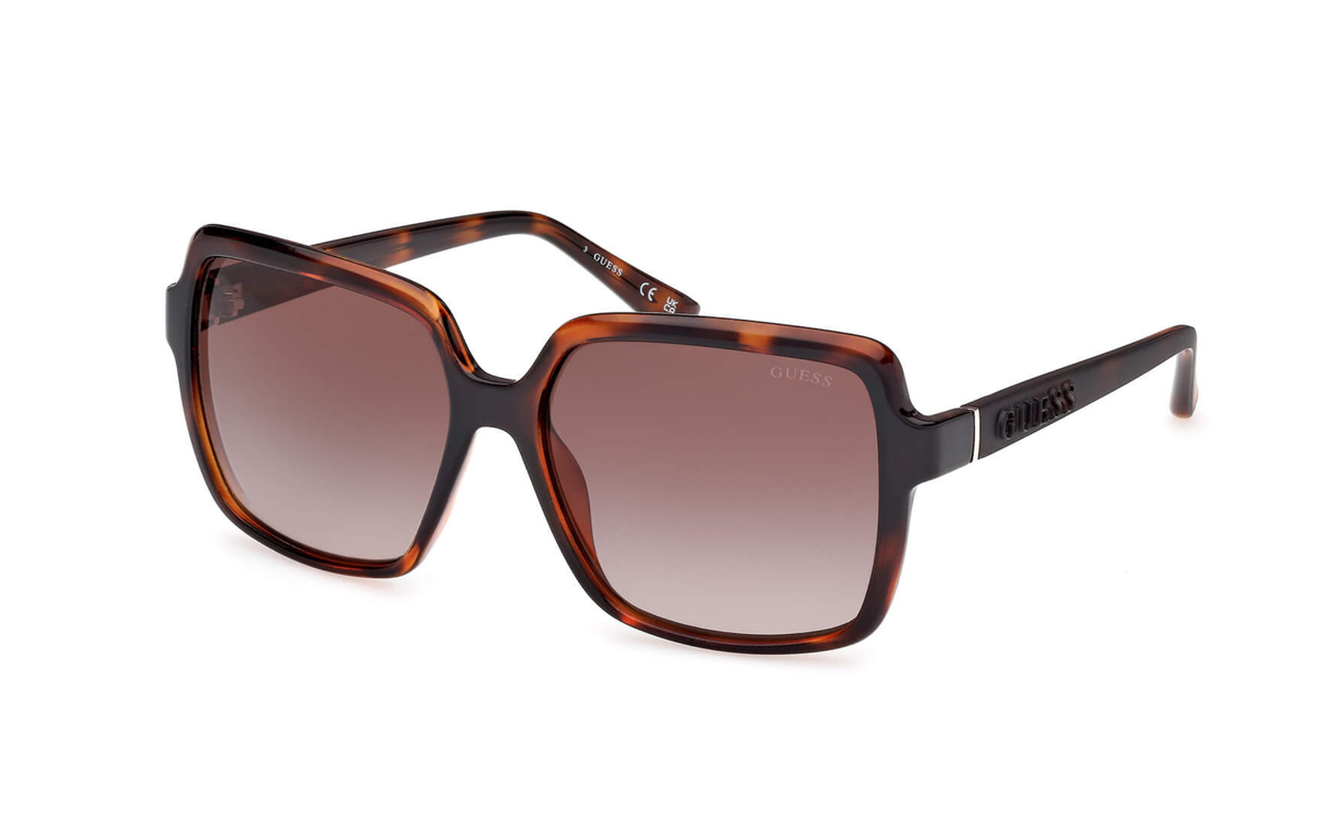 Montura en acetato carey con forma cuadrada de la marca Guess, combina lentes en tono marrón degradado de categoría 3. Visita nuestro centro óptico en Santiago de Compostela ¡Te esperamos!