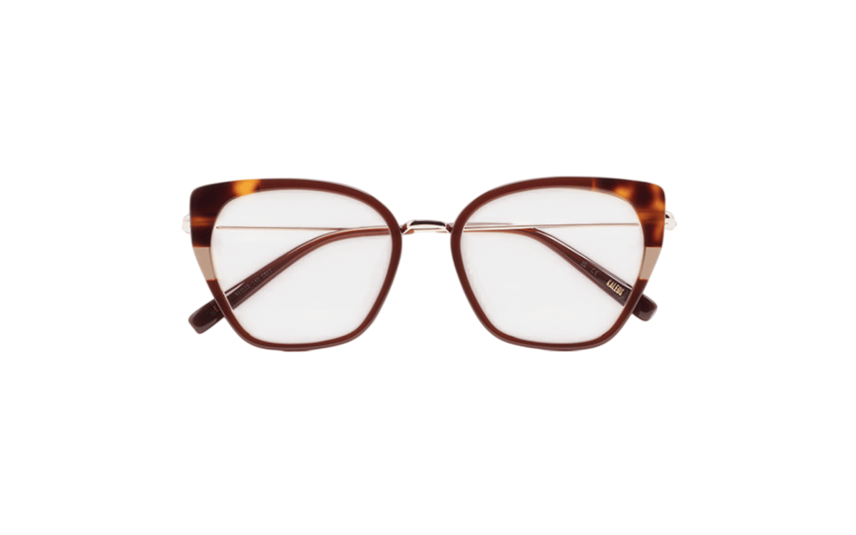 Montura femenina en acetato con forma mariposa de la marca Kaleos en tono burdeos y carey, combina puente y varillas en metal dorado. Visita nuestro centro óptico en Santiago de Compostela ¡Te esperamos!