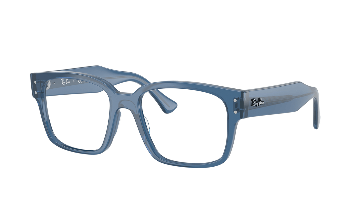 Montura en acetato marcado de la marca Ray-Ban con forma cuadrada en color azul translúcido, detalles en plateado en ambos talones. Visita nuestro centro óptico en Santiago de Compostela ¡Te esperamos!