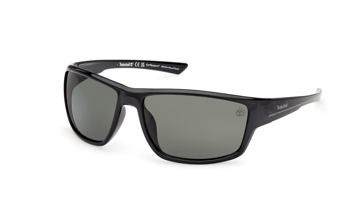 Montura masculina curvada de Timberland en acetato negro brillo con forma rectangular, combina  lentes de categoría 3 en verde uniforme con antirreflejante por la cara interna, es polarizada. Visita nuestro centro óptico en Santiago de Compostela ¡Te esperamos!