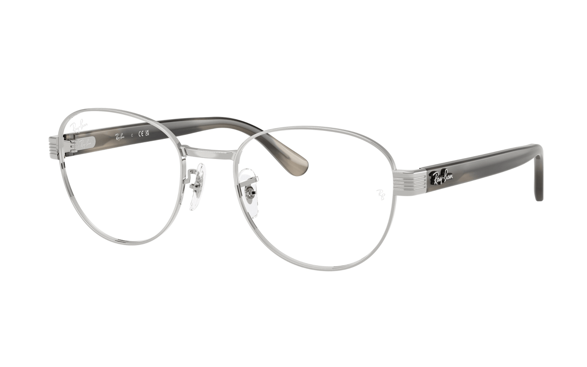 Montura metálica unisex con forma de redonda de color plateado de la marca Ray-Ban, combina varillas en acetato gris. Visita nuestro centro óptico en Santiago de Compostela ¡Te esperamos!