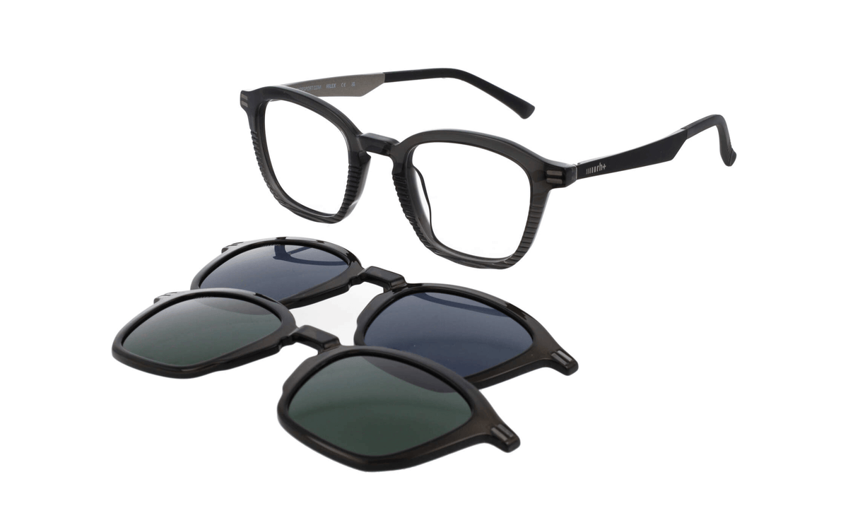 Montura unisex de Zero rh+ con forma cuadrada en color gris translúcido, combina varillas en negro mate y puente en herradura. Viene con dos clips de sol polarizados de categoría 3: uno con lentes de color verde uniforme y otro con lente gris uniforme. Visita nuestro centro óptico en Santiago de Compostela ¡Te esperamos!