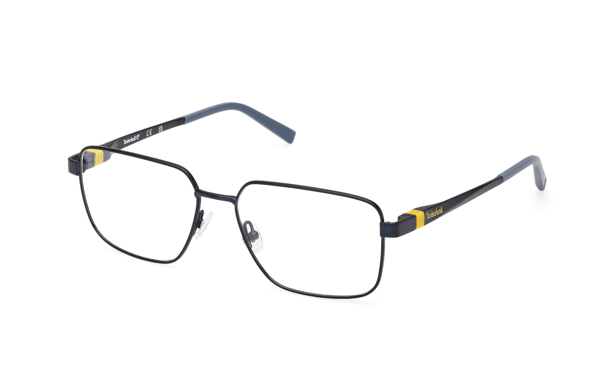 Montura unisex de Timberland en metal azul con forma rectangular, combina detalles amarillos en ambas varillas. Visita nuestro centro óptico en Santiago de Compostela ¡Te esperamos!